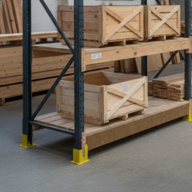 Optimisez la sécurité de vos zones de stockage avec notre ensemble de protection robuste. Contrairement aux protections 100% acier qui peuvent transmettre l'onde de choc au sol, le bastaing en bois absorbe l'impact, limitant ainsi les dommages sur vos dalles béton et vos montants de racks.